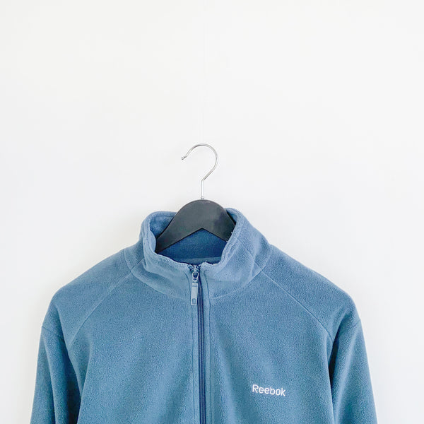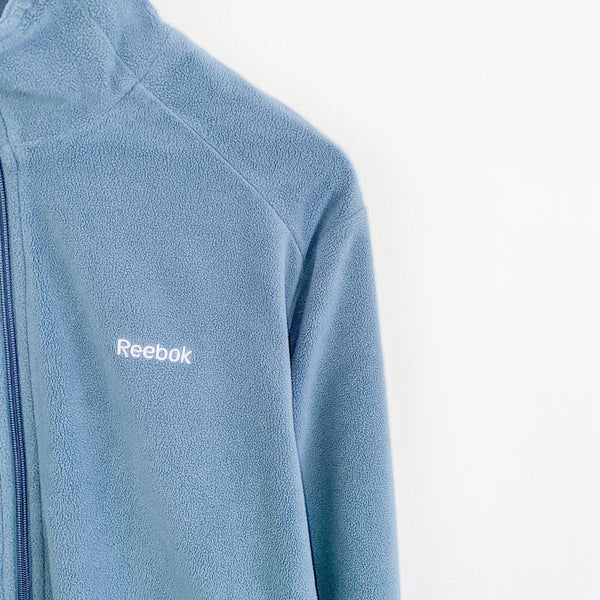 Vintage Reebok fleece zip up track jacket windbreaker sweatshirt longsleeve tee pullover jumper in light blue. Unisex. Same/Next day postage, instant buy is on! Great condition. Has a logo on the front. Label says M, we recommend S. Measurements: * Pit to pit - 20in/53cm * Top to bottom - 27in/70cm * Pit to cuff - 20in/52cm Please message with any questions AH12