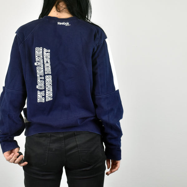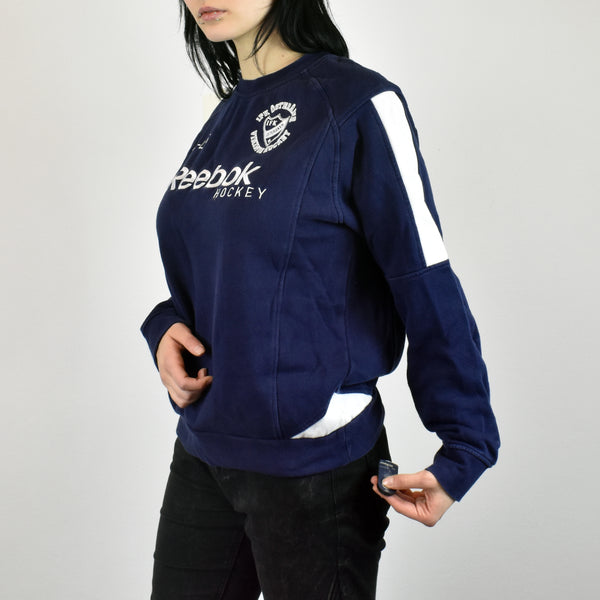 Vintage Reebok sweatshirt jumper sweater pullover hoodie in navy blue. Very good condition. Has the brand name on the front. Size M best fitting. Model is 165cm/5ft5. Please message with any questions 👌