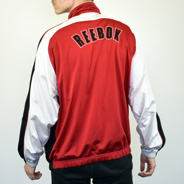 Vintage Reebok tracksuit track jacket fleece windbreaker in red, white and black. Unisex. Same/Next day UK postage, instant buy is on! Very good condition. Has a logo on the front and a big spellout on the back. Size M/L best fitting. Model is 181cm/5ft11. Please message with any questions 👌