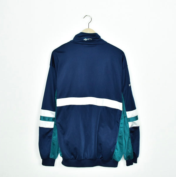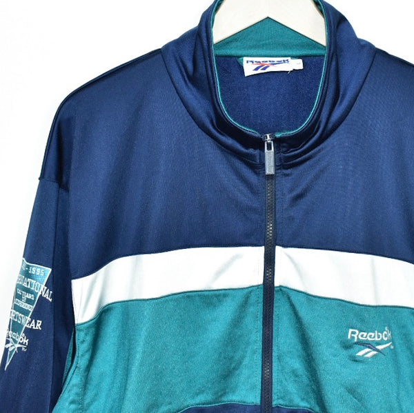 Vintage Reebok tracksuit trackie jacket zip up sweater in cyan and dark blue. Unisex. Same/Next day UK postage, instant buy is on! Very good condition. Features an embroidered Reebok logo on the front, back of the collar and on one of the sleeves. Label says L, we recommend L.