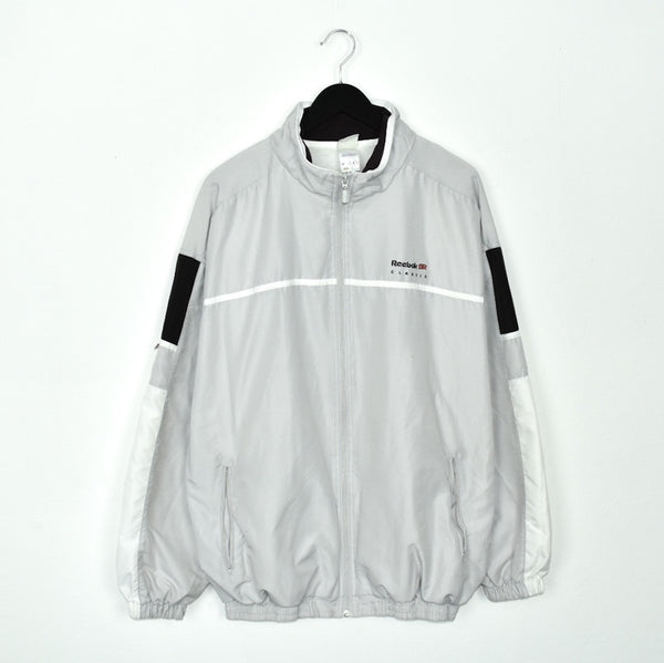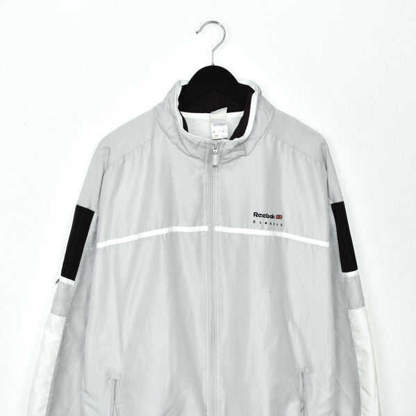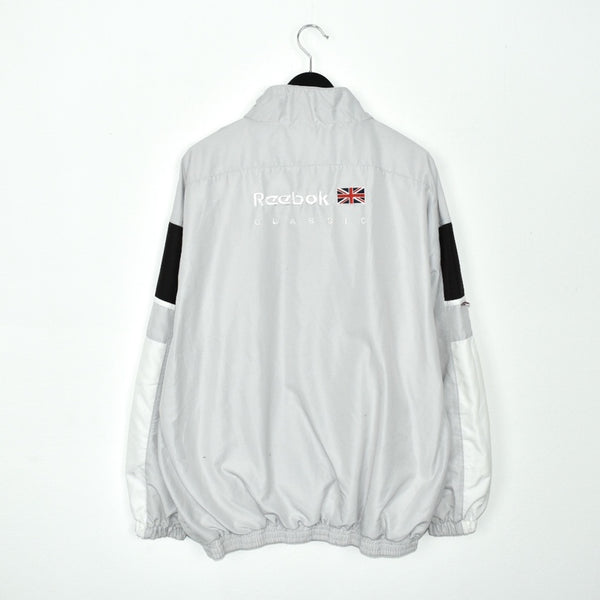 Vintage Reebok windbreaker tracksuit fleece longsleeve tee pullover sweatshirt jumper in grey black white. Unisex. Same/Next day postage, instant buy is on! Great condition. Has a logo on the front and back. We recommend XL.