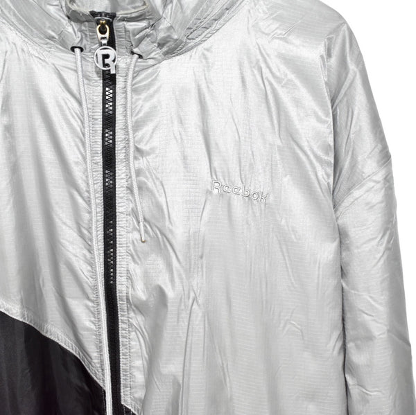 Vintage Reebok windbreaker zip up tracksuit track jacket trackie sweater jumper sweatshirt pullover long sleeve in grey and black. Unisex. Same/Next day UK postage, instant buy is on! Good condition. Features logo on the front and back. Label says XL, we recommend XL.