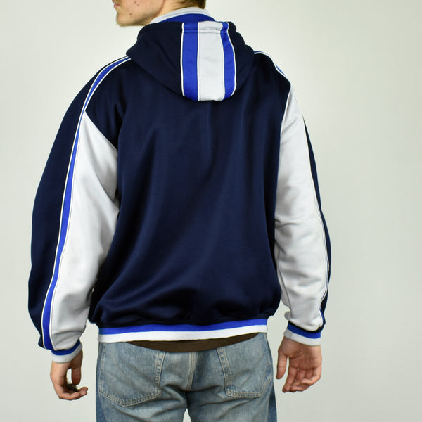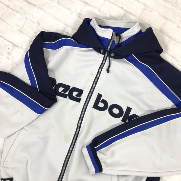 Vintage Reebok zip up hoodie jumper sweater pullover in white and blue. Unisex. Same/Next day postage, instant buy is on! Good condition, apart from few minor stains on the front. Has a big spellout on the front. Size M/L best fitting. Model is 181cm/5ft11. Please message with any questions 👌