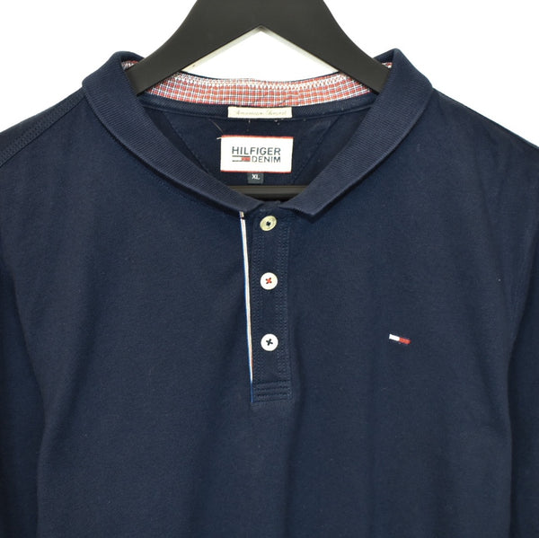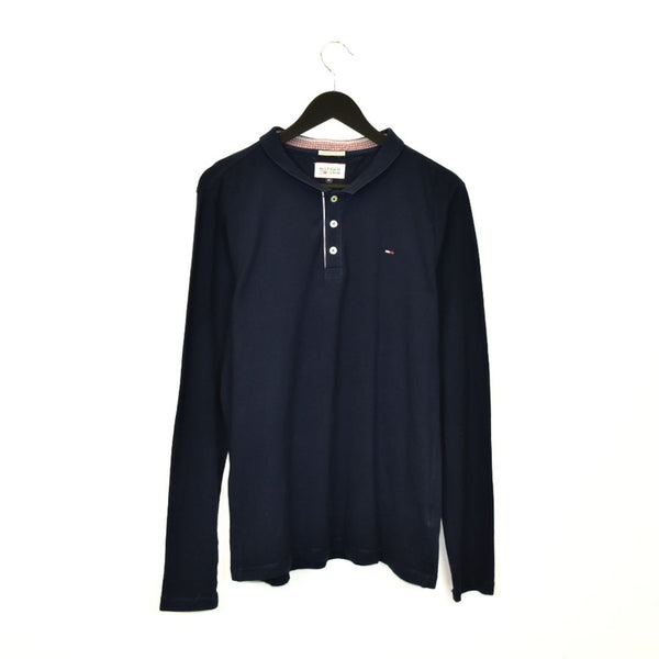Vintage Tommy Hilfiger long sleeve polo shirt t-shirt pullover in navy blue. Unisex. Same/Next day postage, instant buy is on! Features a small logo on the front. Great condition. We recommend L.