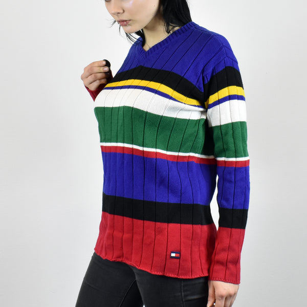 Vintage Tommy Hilfiger sweater pullover jumper in red, black, blue, white, yellow and green. Same/Next day postage, instant buy is on! Great condition. Size M best fitting. Model is 165cm/5ft5. Please message with any questions 👌