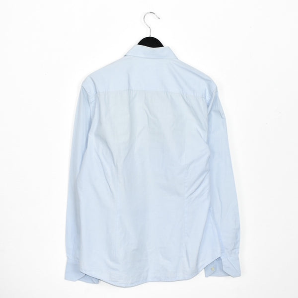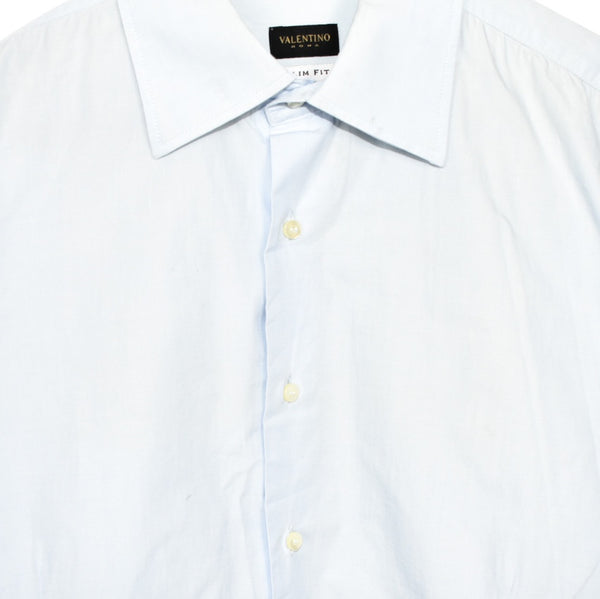 Vintage Valentino button down formal shirt long sleeve blouse top in light blue. Linen. Unisex piece. Same/Next day postage, instant buy is on! Great condition. Label says 17/43, we recommend XL. Measurements: